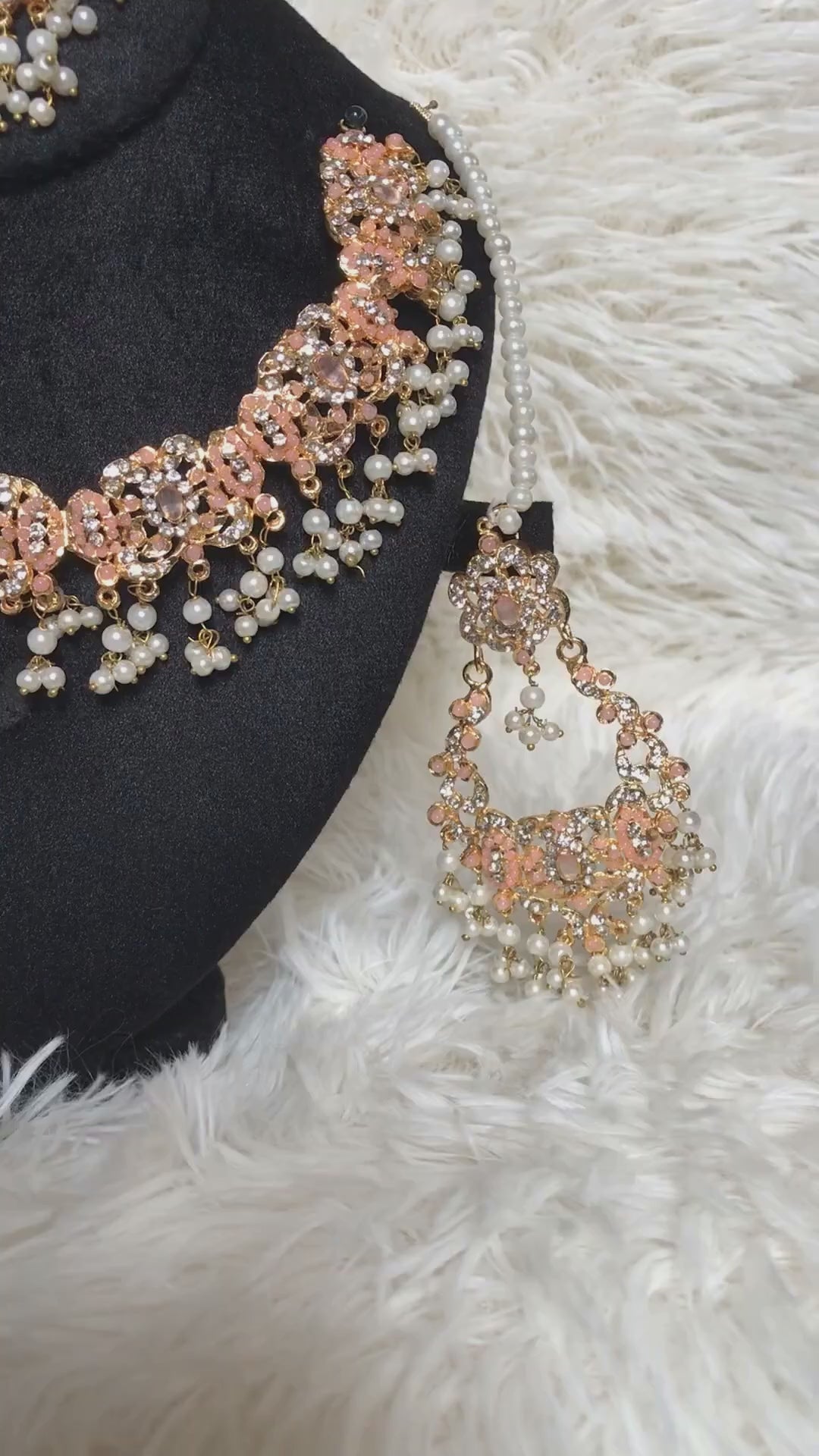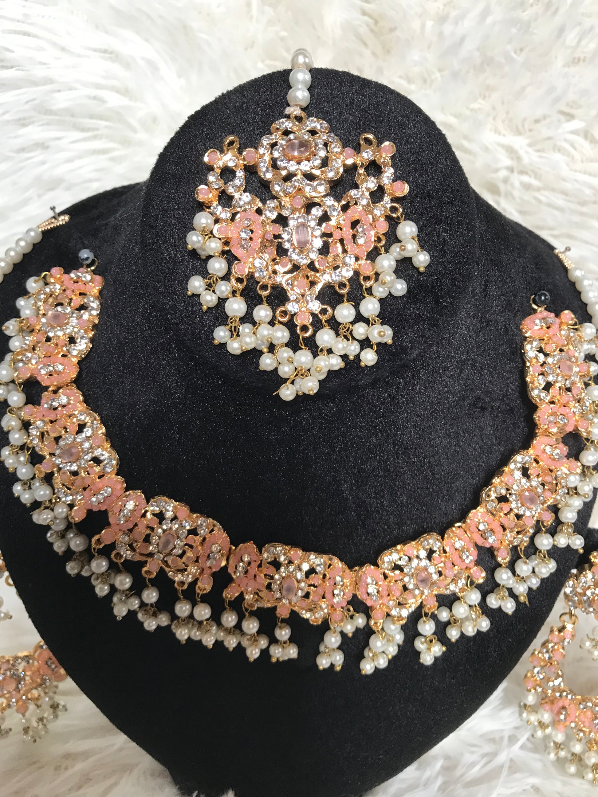 The delicate peach tones paired with luminous pearl drops create a graceful, radiant finish, making this set ideal for mehndi, engagement, dholki, and reception wear.