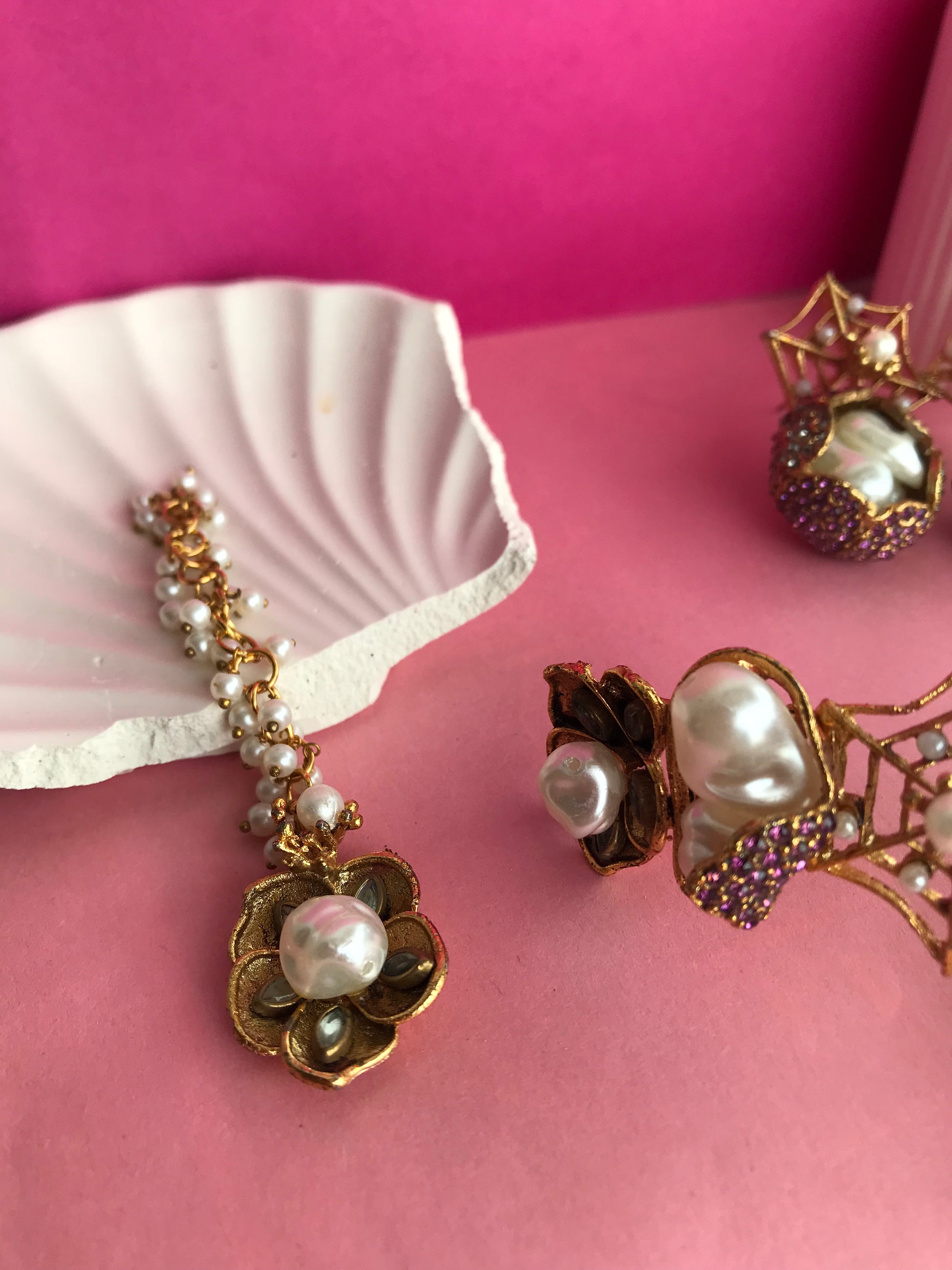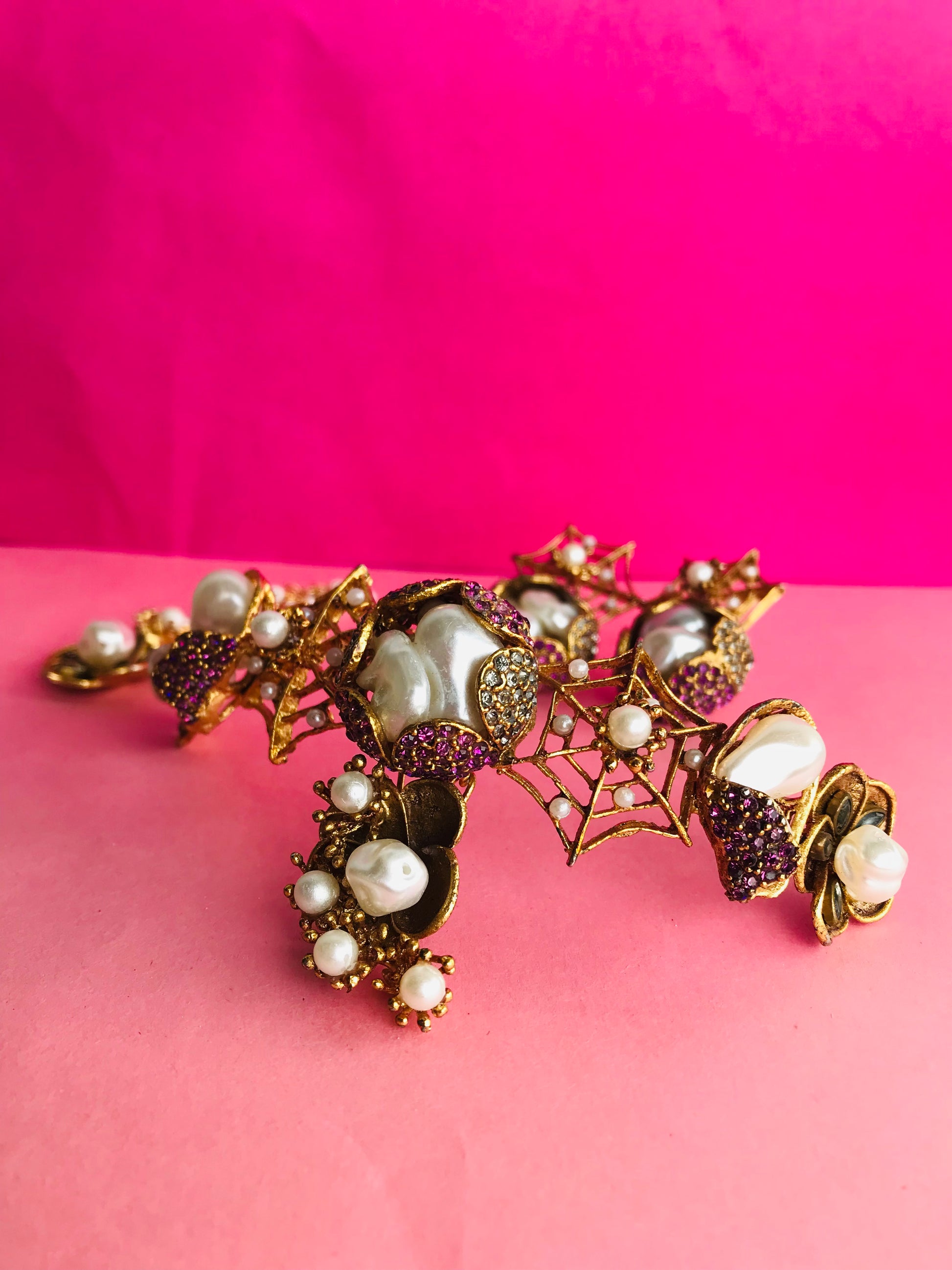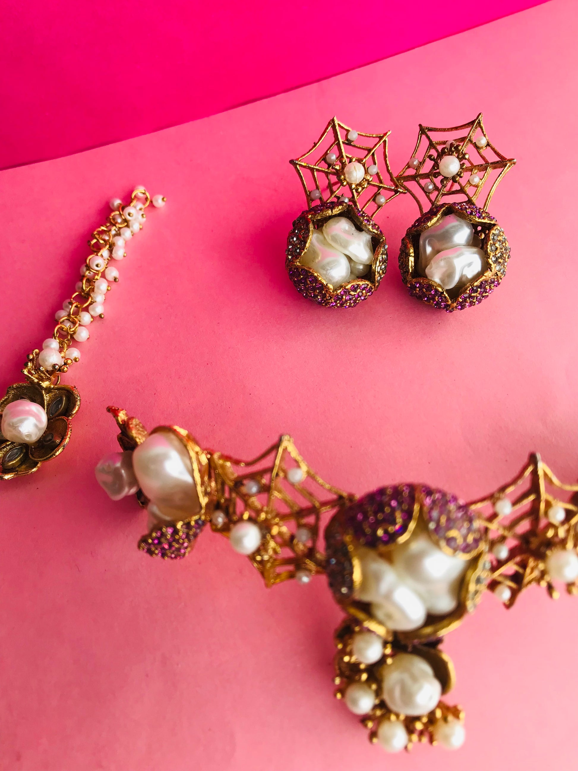 A bold fusion of fantasy and high fashion. This unforgettable three-piece set, featuring a Necklace, matching Earrings, and a dramatic Maang Tikka, offers a unique and luxurious statement. The pieces are beautifully crafted with intricate Gold-Toned Metalwork forming striking spiderweb and star motifs. These unusual webs cradle large, lustrous Baroque Pearls and are accented by sparkling pave-set stones in rich Magenta/Purple hues. This unconventional set is a captivating choice for the fashion-forward bride, grand costume event, or anyone seeking a high-impact, artistic heirloom.