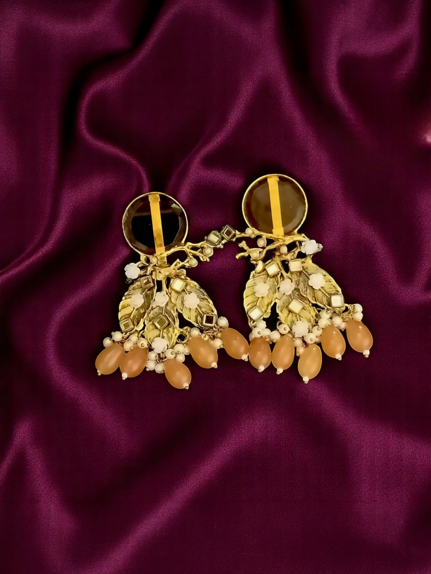A fusion of vintage glamour and natural elegance. These captivating earrings feature a sleek, dark Doublet Stone stud complemented by intricate, flowing gold-toned leaf motifs. Delicately accented with miniature pearls and soft peach/nude tear-drop beads, these earrings evoke the quiet beauty of a desert bloom. The perfect bohemian-chic statement for day or evening wear.