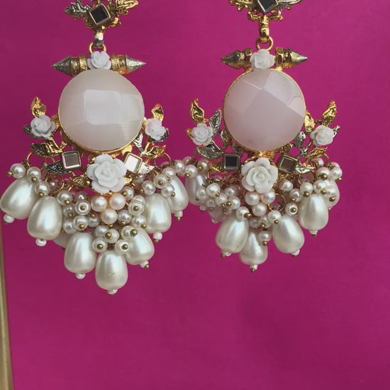 Luxurious craftsmanship meets vibrant color. These exquisite chandelier earrings feature a stunning central doublet stone surrounded by intricate, gold-plated detailing, delicate white floral embellishments, and dangling pearl-tipped drops. A statement piece perfect for weddings, festive occasions, or elevating any ensemble. Available in four regal color variants: Maroon, Green, White, and Golden.