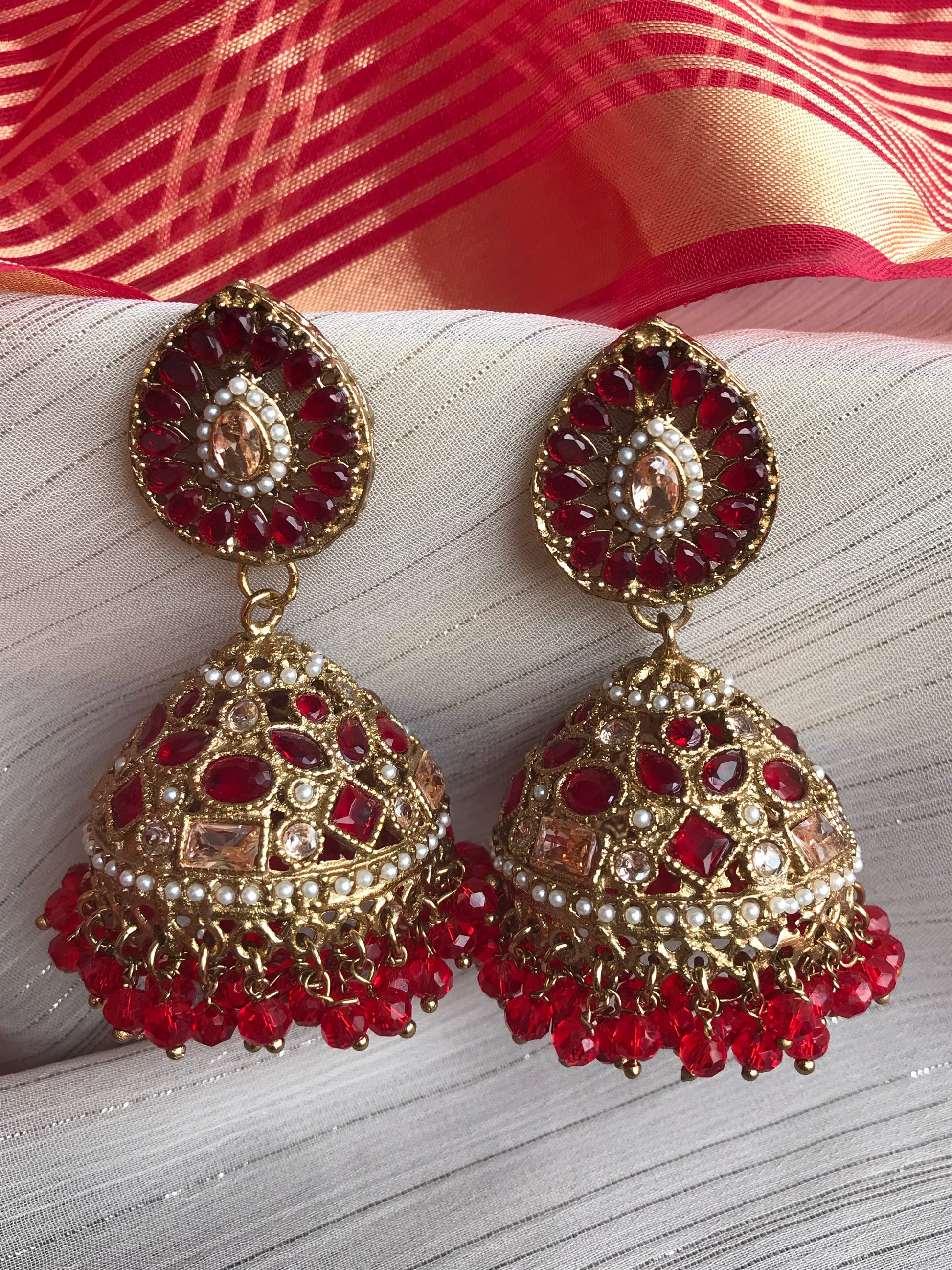 Artificial Egyptian-style royal jhumka earrings studded with crystals, pearls and colored stones. Elegant and festive.
