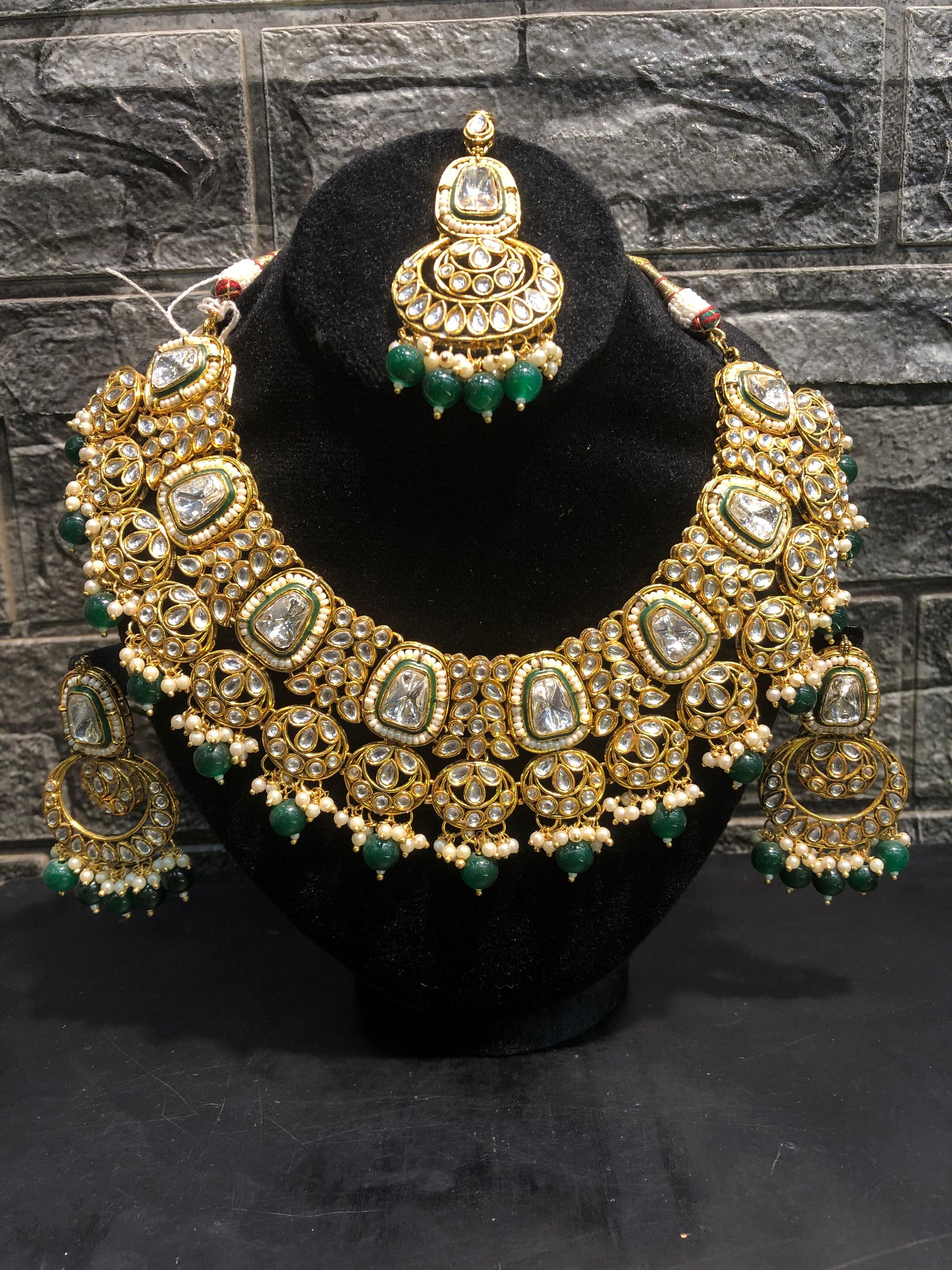 - Stone Style: Traditional flat-cut Kundan (Polki-style) stones with clear/white foil backing.