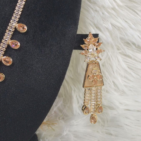 Artificial jewellery set with sleek crystal chain, tassel pendant and matching earrings. Introducing the 𝐒𝐚𝐡𝐚𝐫 𝐑𝐚𝐝𝐢𝐚𝐧𝐭 𝐒𝐞𝐭 — a masterpiece crafted with intricate crystal detailing and geometric elegance. Perfect for modern brides and evening wear, this piece captures sophistication with a hint of royal charm. 💫