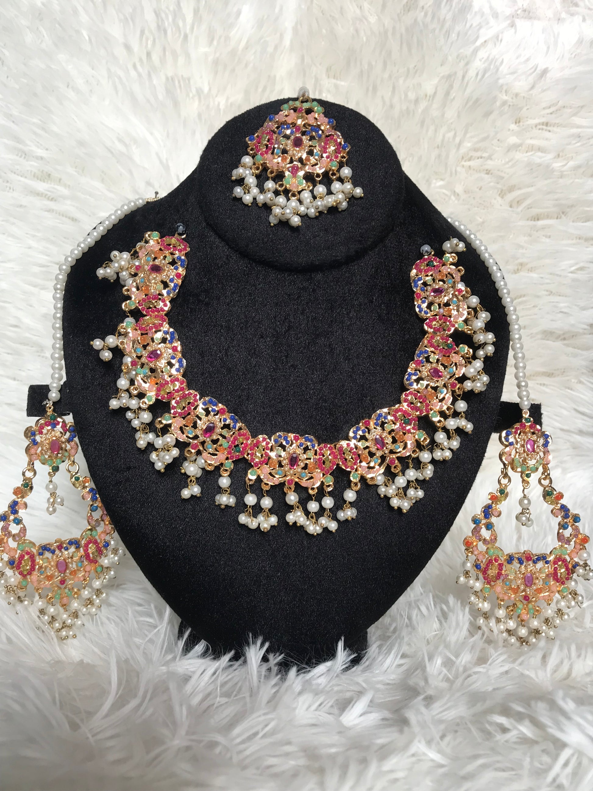 Artificial Turkish jewellery set including necklace, earrings and tikka. Ornate details and stones for festive and wedding looks.